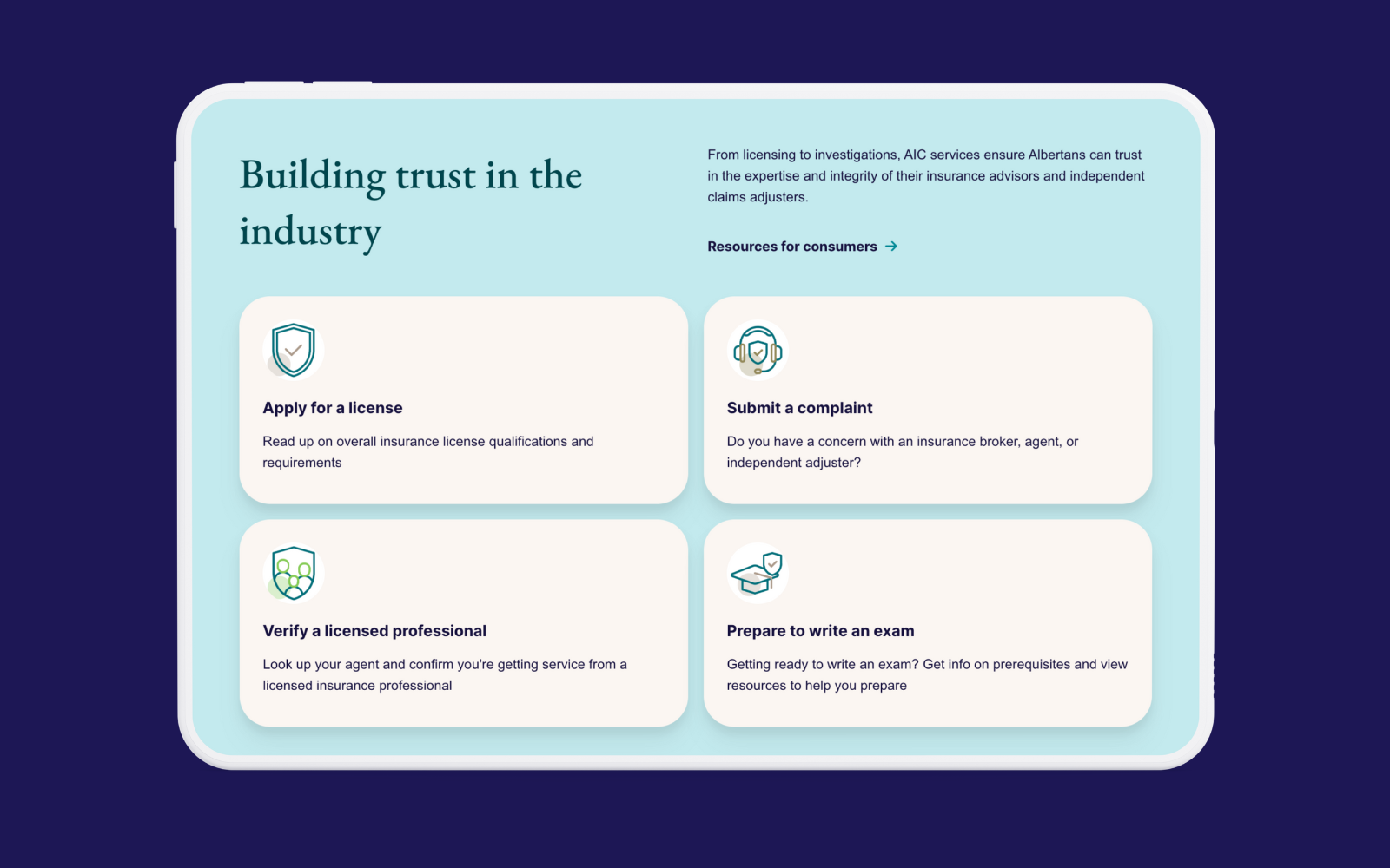 AIC needed a modern website with a fresh aesthetic that efficiently presented information about insurance licenses and how AIC protects Alberta consumers. The new website needed to uphold the industry’s reputation and provide both license holders and consumers with excellent service. Key project goals included: